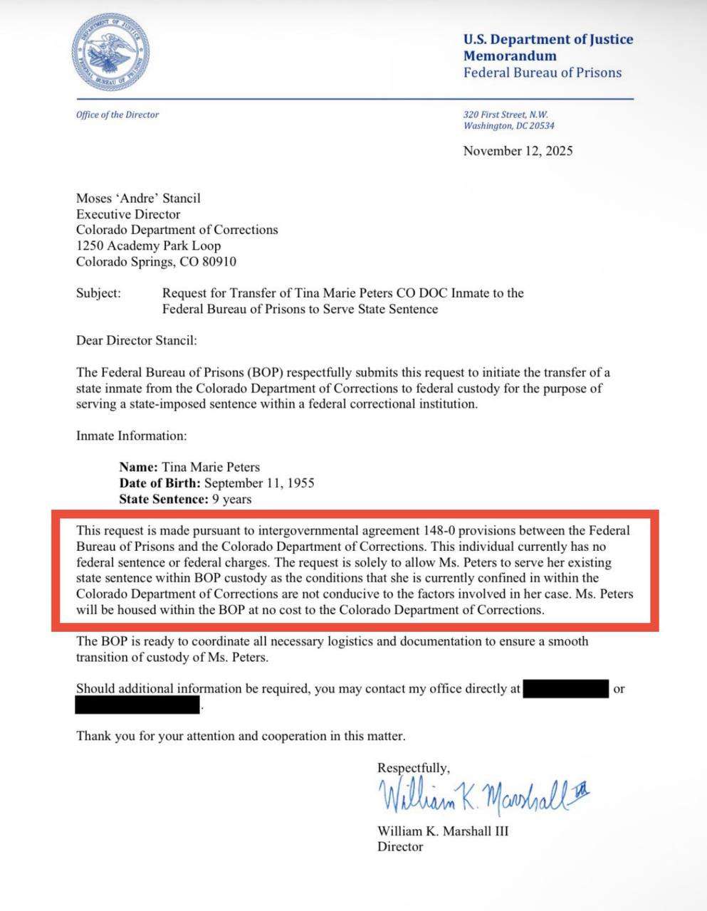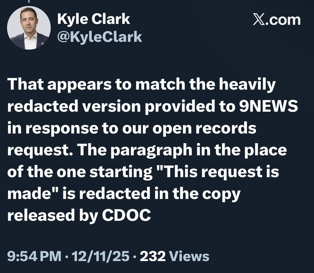 Kyle Clark from Colorado’s NBC local affiliate “9 News” confirmed that the paragraph in the red box was redacted in the version of the order released to their newsroom by the Colorado Department of Corrections.