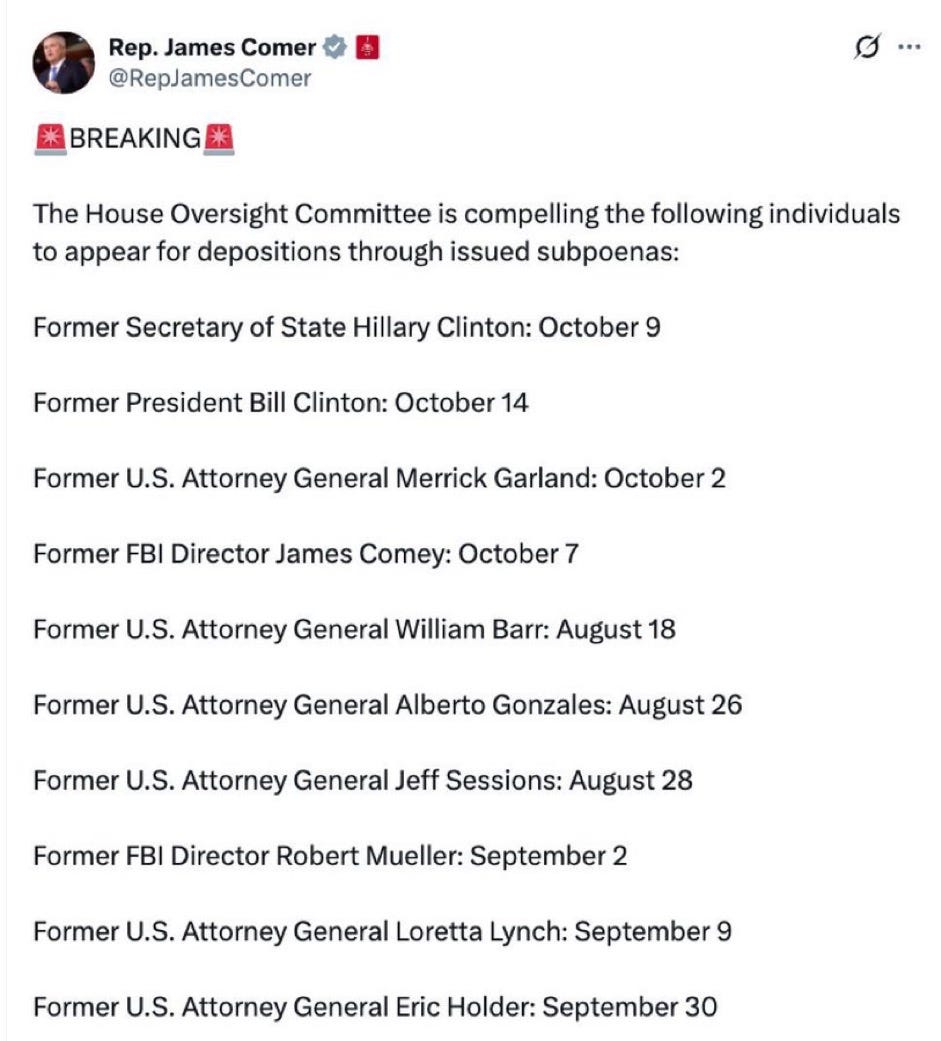 The House Oversight Committee has issued subpoenas seeking testimony and records related to the Jeffrey Epstein investigation, targeting several former top U.S. officials — including Bill and Hillary Clinton, former FBI Directors James Comey and Robert Mueller, and a number of current and former Attorneys General.